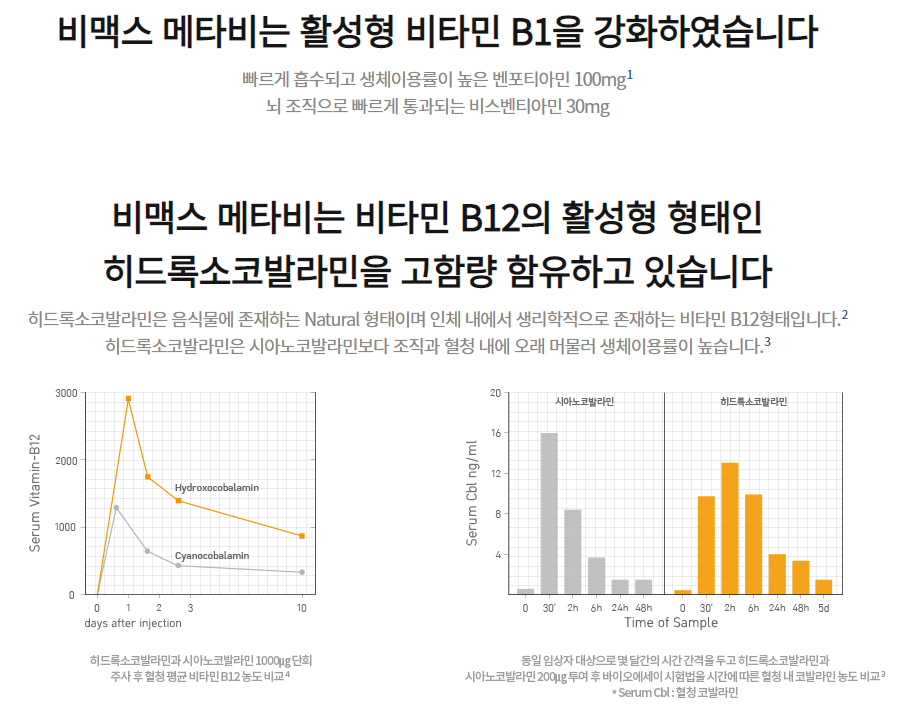 기본적으로 비맥스는 이름에서도 알 수 있듯이 비타민B 군에 집중을 한 의약품입니다. 기존 비맥스 메타의 성분을 어느 것 하나 줄이지 않고 그대로 비타민B1, B12, 폴산, L-시스테인 성분을 추가한 것을 알 수 있습니다.